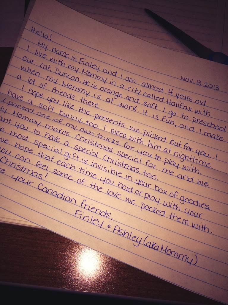 I hope you like the present we picked out for you. I have a soft bunny, too. I sleep with him at nighttime. I packed one of my trucks for you to play with. My Mommy makes Christmas special for me, and we want you to have a special Christmas, too.