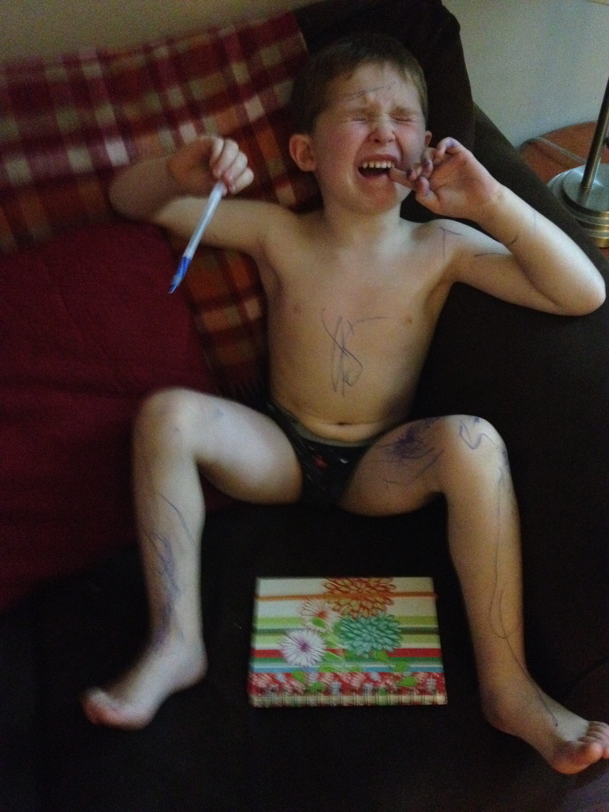 Suffice it to say that it took everything in me to not die laughing. When I walked into the living room, he had his arms on his knees, head hanging, knowing damn well he’d done something he shouldn’t have. The minute he saw me, the tears – they came a-flowin’. I snort-laughed all the way to the bathtub.