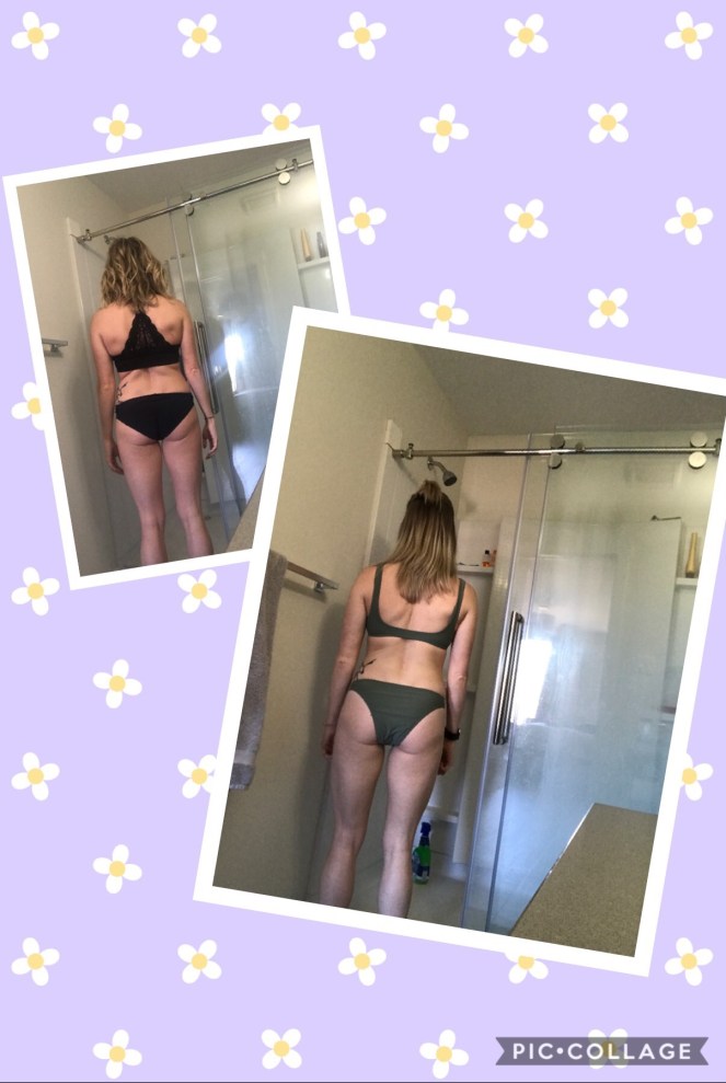 That’s why I no longer consider my weight a goal. Take the photos below for example. On the left (in the black bikini), I weighed between 110-115lbs. In the photos on the right, I’m about 120-123lbs.